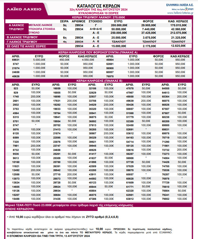 Έτσι και στην 32η κλήρωση της 6ης Αυγούστου ο τυχερός αριθμός που έβγαλε η κληρωτίδα ήταν αυτός της 5ης σειράς με αριθμό 29934 και Στοιχείο: Γ’