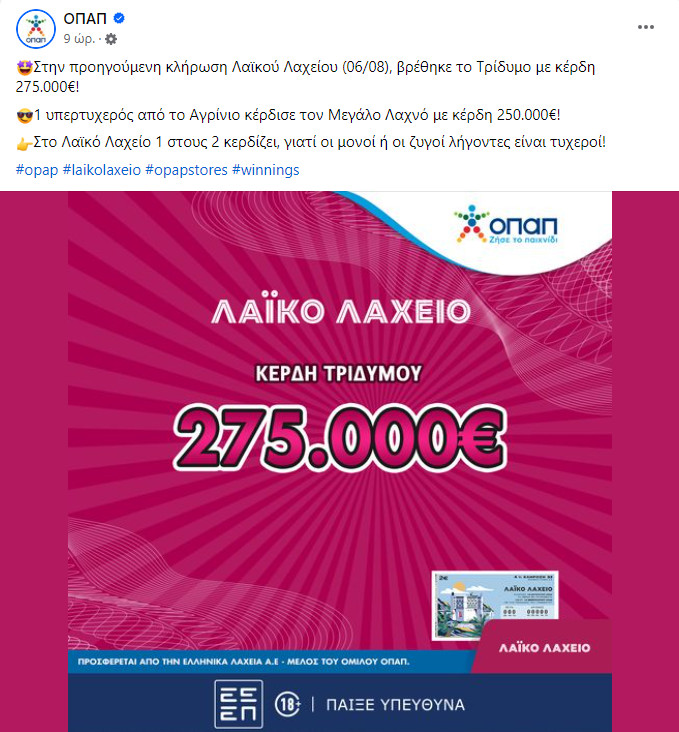 Λαϊκό Λαχείο: Ένας υπερτυχερός από το Αγρίνιο κέρδισε 250.000 ευρώ!