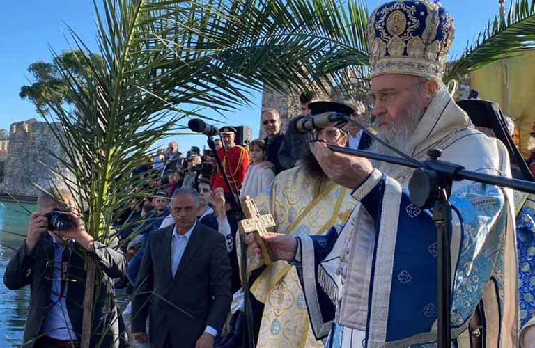 Ακολούθως με πομπή,κλήρος και λαός μετέβησαν στο γραφικό λιμάνι της πόλης για τη ρίψη του Τιμίου Σταυρού και τον καθαγιασμό των υδάτων.