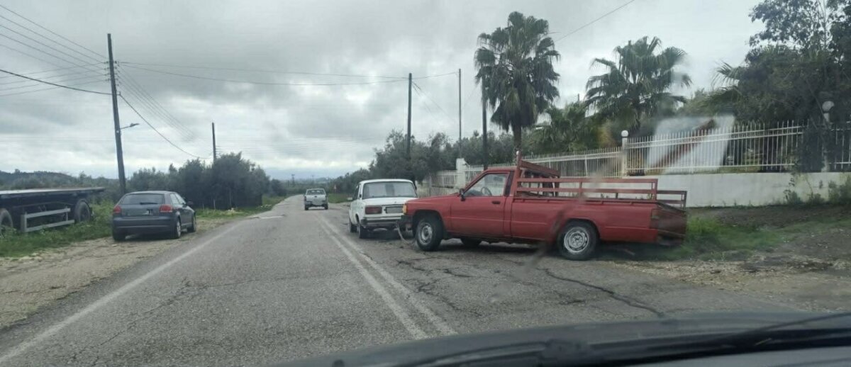 Για να απεγκλωβιστεί ο πίσω δεξιός τροχός, Ι.Χ. «ρυμούλκησε» το αγροτικό!