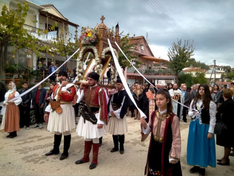 Προπορευόταν η Φιλαρμονική του Δήμου της Ιεράς Πόλεως Μεσολογγίου κι ακολουθούσαν μαθητές του Δημοτικού Σχολείου με την ελληνική Σημαία, με παραδοσιακές φορεσιές νέοι και νέες του Κατηχητικού Σχολείου Λεσινίου αλλά και του Ομίλου Πολιτισμού Οινιαδών «Ελένη Γαντζούδη», νέες με την εικόνα των Εισοδίων της Θεοτόκου από τη Βυζαντινό Ιερό Ναό, τοπικοί άρχοντες και πλήθος πιστών. Στο τέλος της λιτανείας το όμορφο έθιμο να περνούν όλοι οι πιστοί κάτω από την εικόνα τηρήθηκε και φέτος.