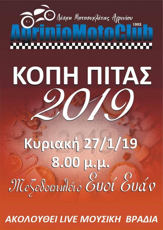 Η Λέσχη Μοτοσικλέτας Αγρινίου (ΛΕ.ΜΟ.ΤΑ ) σας εύχεται καλή χρονιά και σας προκαλεί στην καθιερωμένη κοπή της Πρωτοχρονιάτικης πίτας που θα πραγματοποιηθεί την Κυριακή 27 Ιανουαρίου 2019 και ώρα 20:00 στο μεζεδοπωλείο Ευοι Ευαν. Θα ακολουθήσει live μουσική βραδιά.