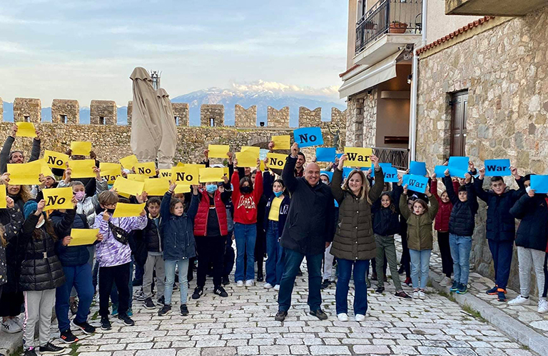 Μαθητές από σχολεία της Ευρώπης που συμμετέχουν στο πρόγραμμα Erasmus+ και βρίσκονται αυτές τις μέρες στη πόλη της Ναυπακτου, έστειλαν το δικό τους αντιπολεμικό μήνυμα από το λιμάνι της Ναυπακτου.