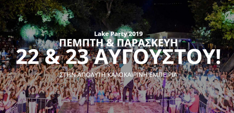 Σύμφωνα, με τα όσα είδαν το φως της δημοσιότητας το φετινό διήμερο κατά τη διάρκεια του οποίου θα πραγματοποιηθεί το Lake Party 2019 στη Δογρή Παραβόλας, Λίμνη Τριχωνίδας είναι την Πέμπτη 22 και Παρασκευή 23 Αυγούστου 2019.