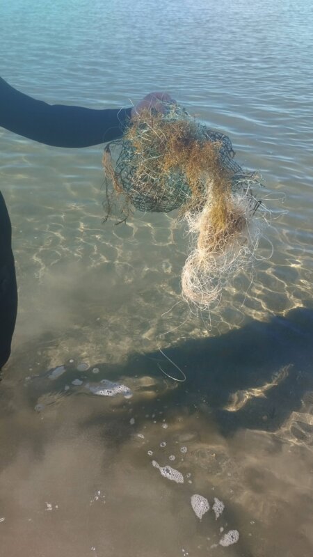 Σήμερα το εντοπίσαμε με το πίσω αριστερό πτερύγιο να έχει μαζέψει ένα μεγάλο όγκο από πετονιά, πλαστικό και δίχτυ και ήταν αδύνατον να κινηθεί.