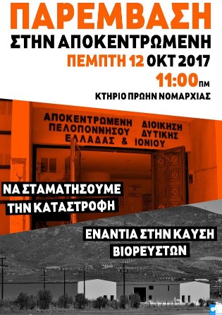 Την Πέμπτη, 12 Οκτωβρίου και ώρα 11:00 π.μ., συγκεντρωνόμαστε στο κτήριο της Περιφέρειας (πρώην Νομαρχία) για να προχωρήσουμε σε παρέμβαση στην Αποκεντρωμένη Διοίκηση στο Μεσολόγγι, δηλαδή την υπηρεσία που υπέγραψε την αδειοδότηση των εργοστασίων βιορευστών στο Εθνικό Πάρκο Λιμνοθάλασσας Μεσολογγίου-Αιτωλικού.