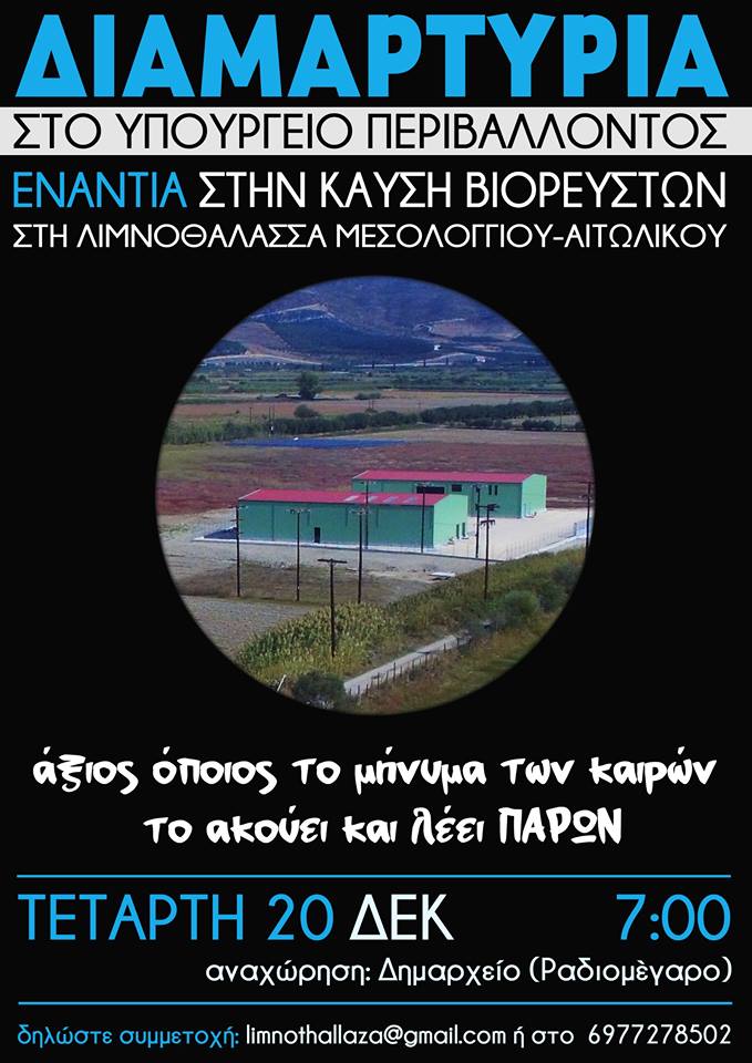 Την Τετάρτη 20 Δεκεμβρίου θα ταξιδέψουμε στην Αθήνα και συγκεκριμένα στο Υπουργείο Περιβάλλοντος για να διαμαρτυρηθούμε για την στάση του υπουργού Περιβάλλοντος Σ.Φάμελλου που ουσιαστικά ανάβει το πράσινο φως για την καταστροφή του Εθνικού Πάρκου Λιμνοθάλασσας Μεσολογγίου Αιτωλικού.