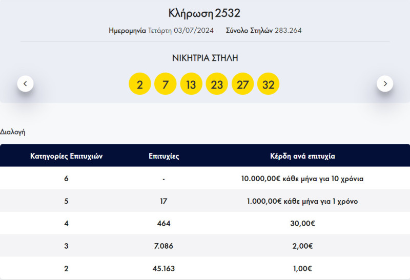 Στην κλήρωση της 2532ης του Λόττο δε βρέθηκε νικητής στην 1η κατηγορία, όμως στη 2η κατηγορία 5άρι βρέθηκαν δεκαεπτά τυχερά δελτία που το καθένα κερδίζει 1.000 ευρώ το μήνα για έναν χρόνο.