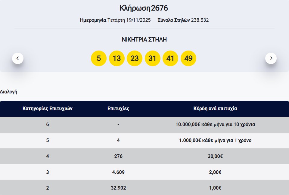 Όπως αναφέρει ο Ο.Π.Α.Π. σε σχετική ανακοίνωση: «Στην κλήρωση της 2676ης του ΛΟΤΤΟ δεν βρέθηκε νικητής στην 1η κατηγορία.