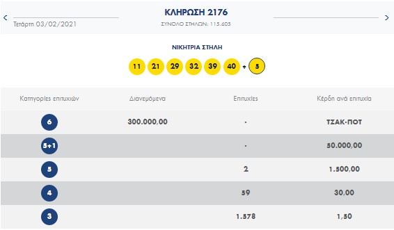 €300.000 τουλάχιστον θα μοιραστούν οι τυχεροί της 1ης κατηγορίας στην επόμενη κλήρωση του Σαββάτου 6/2/2021 μετά το τζακ-ποτ που σημειώθηκε κατά τη σημερινή διαλογή της 2176ης κλήρωσης του Λόττο.