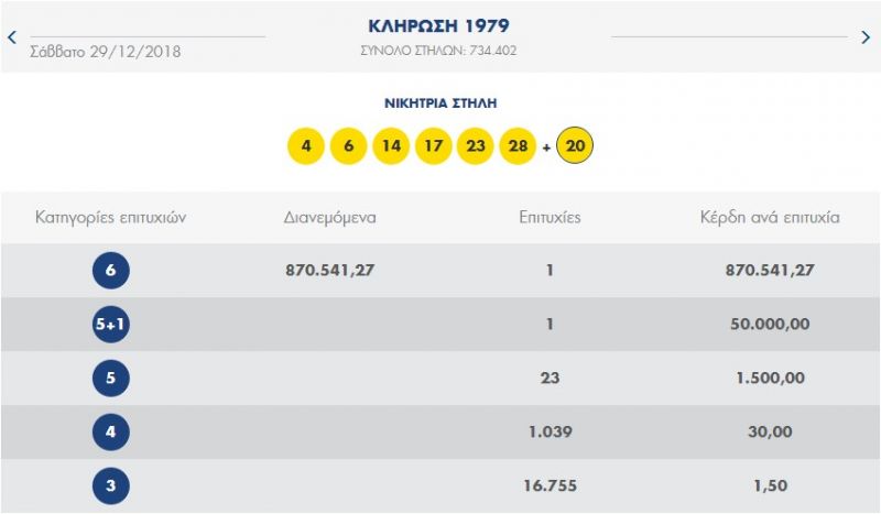 Ένα (1) τυχερό δελτίο βρέθηκε στην 1η κατηγορία (6άρια) κατά τη σημερινή διαλογή της 1979ης κλήρωσης του ΛΟΤΤΟ που κερδίζει το ποσό των € 870.541,27.