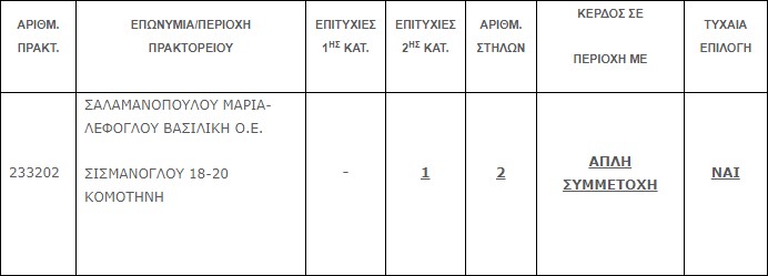 Επίσης στην δεύτερη κατηγορία (5+1) βρέθηκε ένα (1) τυχερό δελτίο που κερδίζει το ποσό των € 50.000,00.
