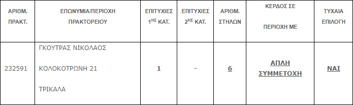 Ένα (1) τυχερό δελτίο βρέθηκε στην 1η κατηγορία (6άρια) κατά τη σημερινή διαλογή της 2019ης κλήρωσης του ΛΟΤΤΟ που κερδίζει το ποσό των € 1.025.666,68.