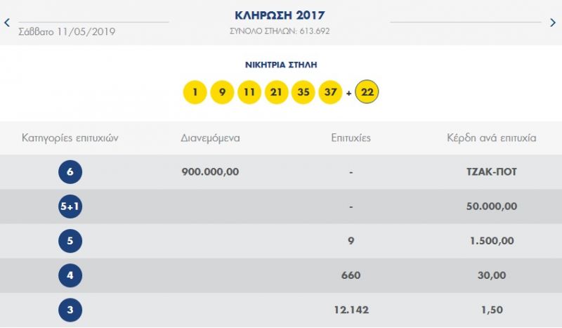 €950.000 τουλάχιστον θα μοιραστούν οι τυχεροί της 1ης κατηγορίας στην επόμενη κλήρωση της ΤΕΤΑΡΤΗΣ 15/05/2019 μετά το ΤΖΑΚ-ΠΟΤ που σημειώθηκε κατά τη σημερινή διαλογή της 2017ης κλήρωσης του ΛΟΤΤΟ.