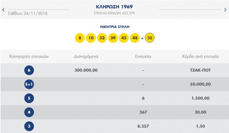 €300.000 τουλάχιστον θα μοιραστούν οι τυχεροί της 1ης κατηγορίας στην επόμενη κλήρωση της ΤΕΤΑΡΤΗΣ 28/11/2018 μετά το ΤΖΑΚ-ΠΟΤ που σημειώθηκε κατά τη σημερινή διαλογή της 1969ης κλήρωσης του ΛΟΤΤΟ.