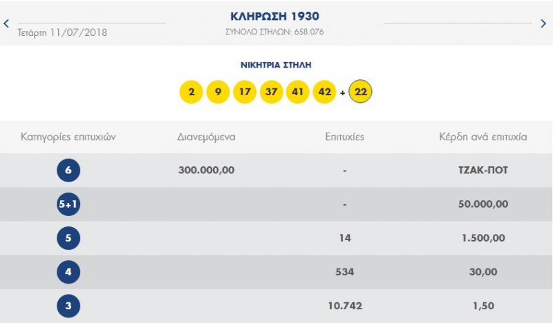 €300.000 τουλάχιστον θα μοιραστούν οι τυχεροί της 1ης κατηγορίας στην επόμενη κλήρωση του ΣΑΒΒΑΤΟΥ 14/07/2018 μετά το ΤΖΑΚ-ΠΟΤ που σημειώθηκε κατά τη σημερινή διαλογή της 1930ης κλήρωσης του ΛΟΤΤΟ.
