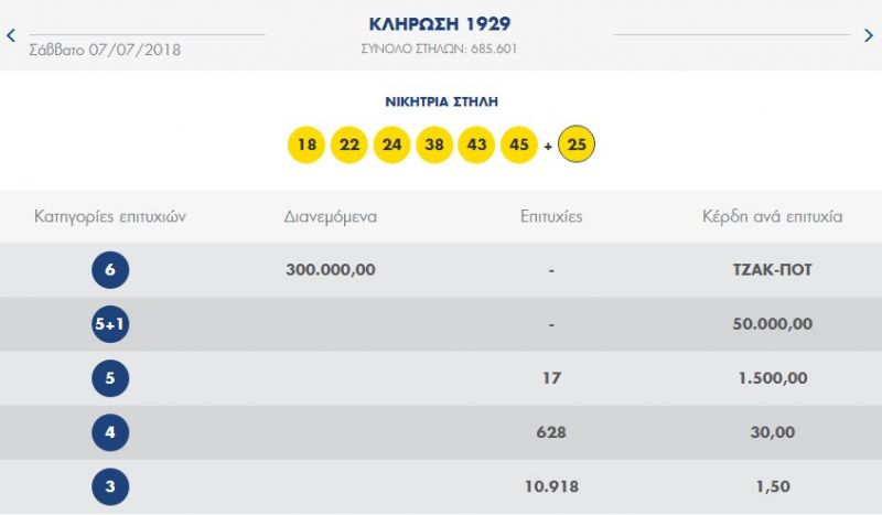 €300.000 τουλάχιστον θα μοιραστούν οι τυχεροί της 1ης κατηγορίας στην επόμενη κλήρωση της ΤΕΤΑΡΤΗΣ 11/07/2018 μετά το ΤΖΑΚ-ΠΟΤ που σημειώθηκε κατά τη σημερινή διαλογή της 1929ης κλήρωσης του ΛΟΤΤΟ.