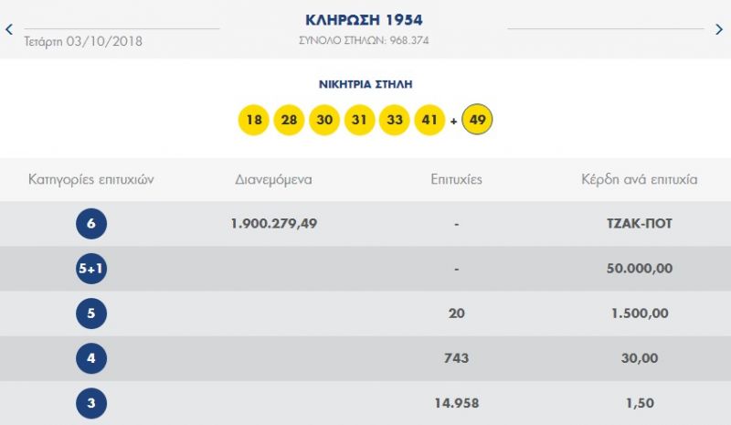€2.000.000 τουλάχιστον θα μοιραστούν οι τυχεροί της 1ης κατηγορίας στην επόμενη κλήρωση του ΣΑΒΒΑΤΟΥ 06/10/2018 μετά το ΤΖΑΚ-ΠΟΤ που σημειώθηκε κατά τη σημερινή διαλογή της 1954ης κλήρωσης του ΛΟΤΤΟ.