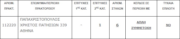 Επίσης στην δεύτερη κατηγορία (5+1) βρέθηκε ένα (1) τυχερό δελτίο που κερδίζει το ποσό των € 50.000,00.