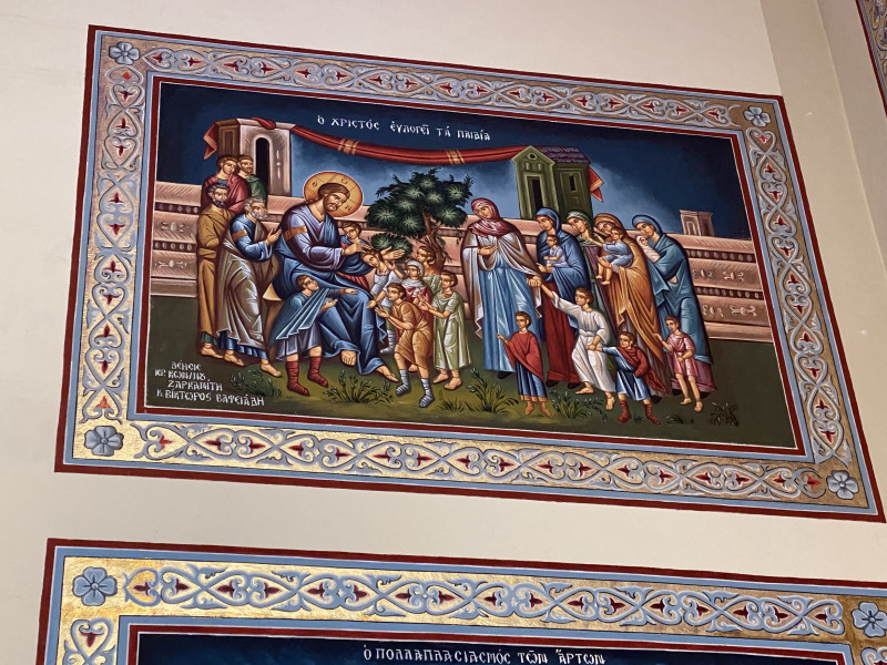 Είναι αξιοσημείωτο το γεγονός ότι ο μακαριστός π. Κωνσταντίνος χρηματοδότησε μια μεγάλη αγιογραφική παράσταση στον Ναό με τον Χριστό να ευλογεί τα παιδιά, γεγονός που υποσημειώνει την αγάπη του π. Κωνσταντίνου στα παιδιά της Ενορίας του και στην προσευχή του για την πρόοδό τους.