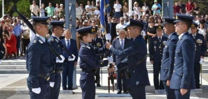 Τρία χρόνια μετά, ο Αρχηγός της τάξης 2019 των νέων ανθυποσμηναγών παρέδωσε στην νεαρή Πατρινή την πολεμική σημαία της Σχολής Ικάρων.