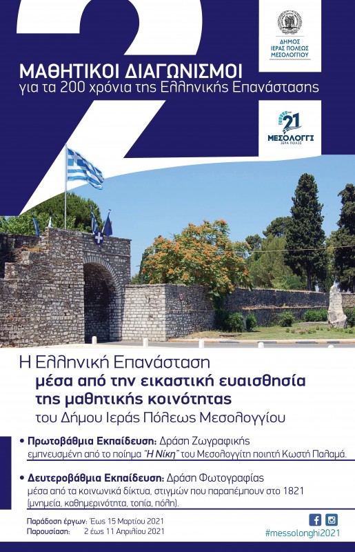 Οι μαθητές της Πρωτοβάθμιας και Δευτεροβάθμιας Εκπαίδευσης του Δήμου Ι.Π. Μεσολογγίου θα έχουν την δυνατότητα να εκφράσουν την καλλιτεχνική και ιδιαίτερα την εικαστική τους ευαισθησία μέσα από τις δυο συμμετοχικές δραστηριότητες που διοργανώνονται από το Πνευματικό Κέντρο με την υποστήριξη της Επιτροπής «Ιερά Πόλις Μεσολογγίου Επανάσταση Αυτοθυσία».
