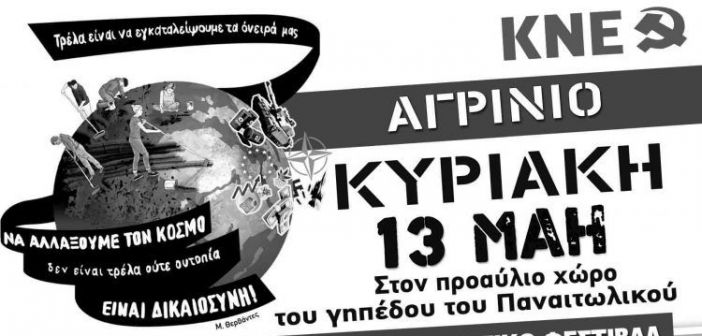 Την Κυριακή 13 Μάη και ώρα 19:00 πραγματοποιείται το Μαθητικό Φεστιβάλ της Κ.Ν.Ε. στο Αγρίνιο στον προαύλιο χώρο του γηπέδου του Παναιτωλικού. Το Φεστιβάλ έχει σύνθημα «Τρέλα είναι να εγκαταλείψουμε τα όνειρά μας, να αλλάξουμε τον κόσμο, δεν είναι τρέλα ούτε ουτοπία, αλλά δικαιοσύνη» (Μ. Θερβάντες).