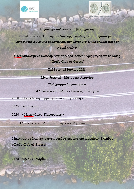 Η Περιφέρεια Δυτικής Ελλάδας σε συνεργασία με το Επιμελητήριο Αιτωλοακαρνανίας τη River Project Κοιν.Σ.Επ και τον καταξιωμένο Chef Ιωάννη Μπαλωμένο, Αντιπρόεδρο Λέσχης Αρχιμαγείρων Ελλάδος (Chef’s Club of Greece) διοργανώνει το Γαστρονομικό Εργαστήρι με θέμα: