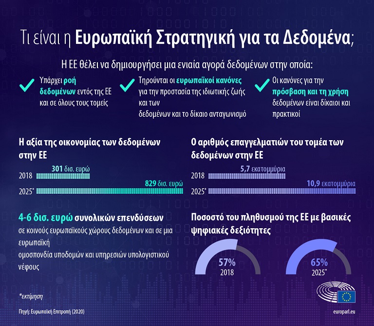 Τα δεδομένα αποτελούν σημαντική πτυχή του ψηφιακού μετασχηματισμού της ΕΕ. Η τεχνητή νοημοσύνη, που αποτελεί προτεραιότητα της ΕΕ, στηρίζεται στην επεξεργασία δεδομένων και η ανάπτυξή της εξαρτάται από τον τρόπο διαχείρισης των δεδομένων στην Ευρώπη. Τα δεδομένα αποτελούν επίσης αναπόσπαστο κομμάτι των ψηφιακών υπηρεσιών που διαμορφώνουν την καθημερινή μας ζωή και την οικονομία. Το Κοινοβούλιο επεξεργάζεται ειδική νομοθεσία για τα δεδομένα ώστε να διασφαλίσει ότι οι πολίτες, οι επιχειρήσεις, η ανάκαμψη και η πράσινη μετάβαση θα επωφεληθούν από μια αποτελεσματική στρατηγική δεδομένων.