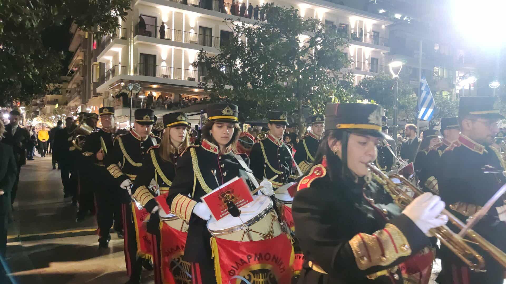 Πριν την άφιξη των Επιταφίων, η Φιλαρμονική του Δήμου Αγρινίου πραγματοποίησε πένθιμη συναυλία στο κέντρο της Πλατείας, ενισχύοντας το κατανυκτικό κλίμα της βραδιάς και συγκινώντας τους παρευρισκόμενους.