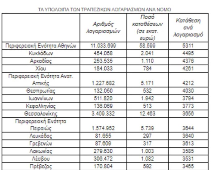 Σε όλες αυτές τις περιοχές, η μέση κατάθεση ξεπερνούσε τα 5311 ευρώ στην Αθήνα, τα 4495 ευρώ στις Κυκλάδες, τα 4376 ευρώ στην Αρκαδία και τα 4261 ευρώ στην Χίο.