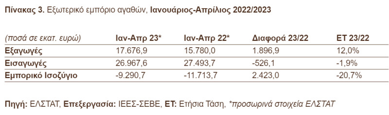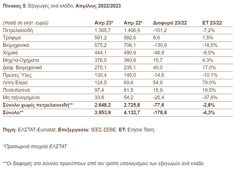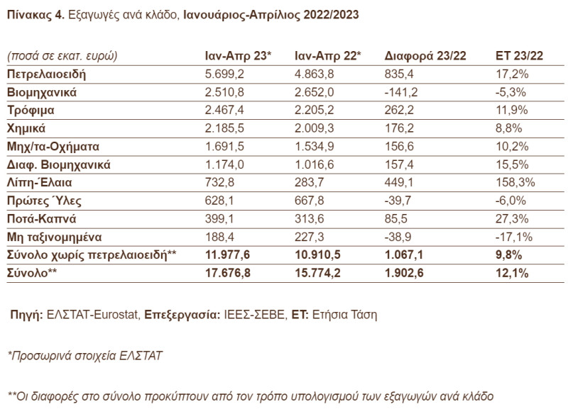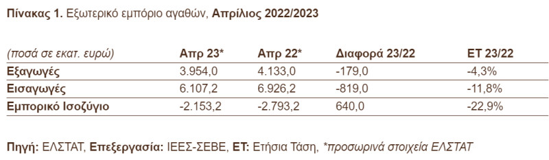 Σύμφωνα με τα προσωρινά στοιχεία που ανακοίνωσε σήμερα 07.06.2023 η Ελληνική Στατιστική Αρχή και την επεξεργασία του ΙΕΕΣ του ΣΕΒΕ, η αξία των ελληνικών εξαγωγών ανήλθε σε €3.954,0 εκατ. τον Απρίλιο του 2023 έναντι €4.133,0 εκατ. τον Απρίλιο του 2022, με τη μείωση να διαμορφώνεται σε €179,0 εκατ., δηλαδή 4,3%.