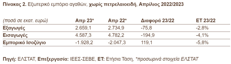 Εξαιρώντας τα πετρελαιοειδή, η εικόνα δεν διαφοροποιείται σημαντικά με τις εξαγωγές να καταγράφουν μείωση ύψους €75,8 εκατ. (δηλαδή 2,8%) και να ανέρχονται σε €2.659,1 εκατ., τις εισαγωγές να μειώνονται κατά €194,9 εκατ. (δηλαδή 4,1%) και να ανέρχονται σε €4.587,3 εκατ. και το εμπορικό έλλειμμα να βελτιώνεται κατά €119,1 εκατ. (δηλαδή 5,8%) και να ανέρχεται σε €1.928,2 εκατ.