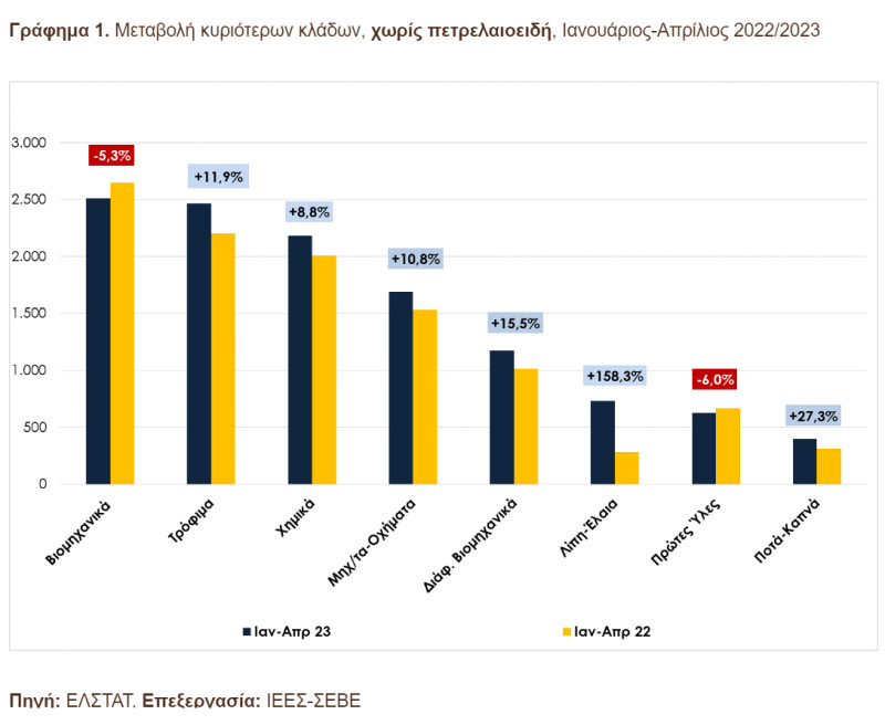Σύμφωνα με τα στοιχεία, στο α’ τετράμηνο του 2023 οι εξαγωγές ήταν αυξημένες κατά 12,0%, δηλαδή €1.896,9 εκατ., με την αξία τους να φτάνει τα €17.676,9 εκατ.