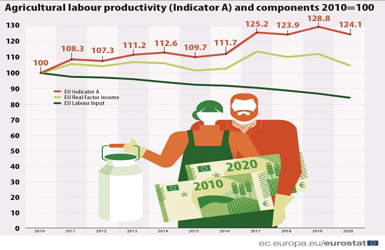 Σύμφωνα με τα τελευταία στοιχεία των οικονομικών λογαριασμών για τη γεωργία (EAA), ο δείκτης παραγωγικότητας της γεωργικής εργασίας εκτιμάται ότι έχει μειωθεί στην Ευρωπαϊκή Ένωση των 27 κρατών μελών ( ΕΕ ) το 2020 (-4%), μετά την αύξηση που παρουσιάστηκε το 2019.