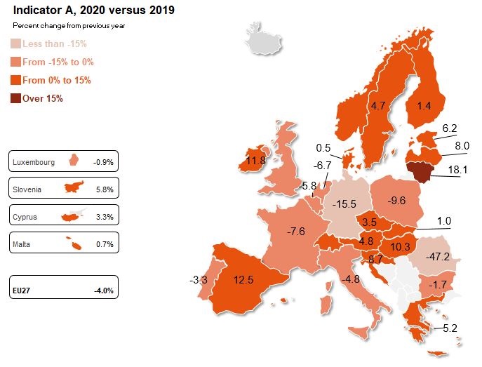 Σύμφωνα με τα στοιχεία της Eurostat, πέντε από τις μεγάλες χώρες που συνεισφέρουν περισσότερο από το ήμισυ του εισοδήματος συντελεστών της ΕΕ, ανέφεραν μείωση του δείκτη γεωργικού εισοδήματος ανά ετήσια μονάδα εργασίας (AWU) το 2020 σε σύγκριση με το 2019: Ρουμανία (-47,2%), Γερμανία (-15,5%) , Πολωνία (-9,6%), Γαλλία (-7,6%) και Ιταλία (-4,8%). Από την άλλη πλευρά, περισσότερα από τα μισά κράτη μέλη σημείωσαν αύξηση το 2020. Τα υψηλότερα ποσοστά αύξησης αναφέρθηκαν για τη Λιθουανία (+ 18,1%), την Ισπανία (+ 12,5%), την Ιρλανδία (+ 11,8%) και την Ουγγαρία (+10,3 %).
