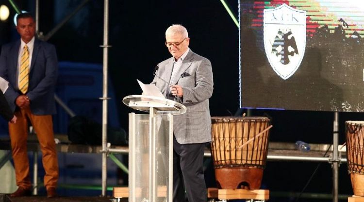 «Είναι ορισμένες περιπτώσεις που το μέγεθος της στιγμής που ζεις σε ξεπερνά. Γιατί είναι ιστορικές στιγμές. Μια τέτοια στιγμή είναι και η αποψινή. Ο χώρος που βρισκόμαστε είναι ιερός, γιατί εδώ, πριν 90 χρόνια πρόσφυγες, λίγο μετά τον ξεριζωμό αποφάσισαν να χτίσουν το γήπεδο της ΑΕΚ. Ήθελαν πρώτα σπίτι για την ομάδα τους και μετά για τους εαυτούς τους. Κι επειδή ο χώρος αυτός συμβόλιζε τα ιερά προσφύγων, γι’ αυτό και τον χαρακτήρισα ιερό. Εδώ δούλεψαν εθελοντικά εκατοντάδες πρόσφυγες, εδώ αγωνίστηκαν οι ποδοσφαιριστές μας γράφοντας ιστορίες, εδώ σηκώσαμε Κύπελλα και πρωταθλήματα. Εδώ έγραψαν ιστορία και οι ανιδιοτελείς παράγοντες, όπως οι Χατζηιωάννου, Γκούμας και Μπάρλος φωτίζοντας το δικό μας δρόμο. Γίναμε και πάλι πρποσφυγες το 2003, όταν χάσαμε τη στέγη μας. Όλα αυτά τα χρόνια μας πόνεσαν, γίναμε αντικείμενο χλεύης, μέχρι να διεκδικήσουμε τη θέση που μας αξίζει. Για να το κάνεις αυτό αρχίζεις από τα θεμέλια και η ΑΕΚ αρχίζει από εδώ. Κινηθήκαμε σε τρεις άξονες: να δημιουργήσουμε ένα περιβάλλον υγιούς ανταγωνισμού στο ποδόσφαιρο και νομίζω τα καταφέραμε και οι εκλογές της ΕΠΟ γίνονται. Ο άλλος να εξυγιάνουμε την ομάδα σε όλους τους τομείς κι εδώ τα πράγματα μπήκαν σε μια γραμμή και θα συνεχίσουμε τις προσπάθειές μας. Ο τρίτος άξονας είναι το γήπεδο. Μας προτάθηκε να κάνουμε γήπεδο αλλού, αλλά η ΑΕΚ μπορεί να είναι ο εαυτός της μόνο στη Νέα Φιλαδέλφεια, γιατί εδώ είναι το σπίτι και τα θεμέλιά της.