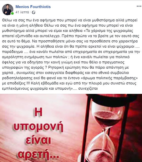 “Θέλω να σας πω ένα αφήγημα που μπορεί να είναι μυθιστόρημα αλλά μπορεί να είναι η μόνη αλήθεια Θέλω να σας πω ένα αφήγημα που μπορεί να είναι μυθιστόρημα αλλά μπορεί να είμαι και αλήθεια «Το χάρισμα της ψυχραιμίας απαιτεί εξυπνάδα και αυτοέλεγχο. Πρέπει πρώτα να τα βρείτε με τον εαυτό σας σε αυτό το θέμα. Να προσπαθήσετε μόνοι σας να προσθέσετε στο χαρακτήρα σας την ψυχραιμία. Η αλήθεια είναι ότι θα πρέπει αρκετοί να είναι ψύχραιμοι …. παράδειγμα …. ένα κανάλι πωλείται από επιχειρηματία σε επιχειρηματία για την αμερόληπτη ενημέρωση των πολιτών ; ή ένα κανάλι πωλείται για πολιτικό όφελος για να οδηγήσει την κοινή γνώμη εκεί που θέλει ο πραγματικός υπογραφών της αγοράς ? Ρητορική ερώτηση που θα πάρει απάντηση με χαρτιά, συνομιλίες στον εισαγγελέα διαφθοράς και στο εθνικό συμβούλιο ραδιοτηλεόρασης εκεί θα φανεί και το έντονο «άρωμα πολιτικής παρέμβασης» με αποδείξεις !!! Καλή εβδομάδα και εγώ από την πλευρά μου συνιστώ στους εμπλεκόμενους ψυχραιμία και υπομονή»…. συνεχίζεται”.