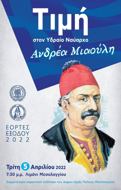 Στο πλαίσιο των εκδηλώσεων των Εορτών Εξόδου 2022, αύριο, Τρίτη 5 Απριλίου διοργανώνεται, για πρώτη φορά, μια σημαντική εκδήλωση, προς τιμήν του Ήρωα της Ύδρας Ναυάρχου Ανδρέα Μιαούλη, που συνέδραμε με τον δικό του μοναδικό τρόπο το πολιορκημένο Μεσολόγγι.