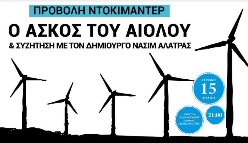 Προβολή του Ντοκιμαντέρ «Ο Ασκός του Αιόλου» θα πραγματοποιηθεί την Κυριακή 15 Ιουλίου, στις 21:00 στην Ταράτσα του Ραδιοφωνικού Σταθμού Ι. Π. Μεσολογγίου. Μετά την προβολή θα ακολουθήσει συζήτηση με τον δημιουργό του Ντοκιμαντέρ Νασίμ Αλάτρας σχετικά με το ζήτημα της Αιολικής Ενέργειας στην Ελλάδα.