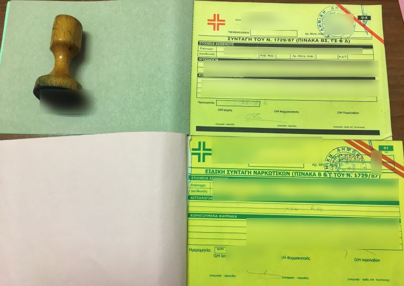 Επίσης κατασχέθηκε στρογγυλή σφραγίδα Δημόσιου Νοσοκομείου συνταγολόγια με ερυθρά διαγράμμιση και πληθώρα άλλων σκευασμάτων