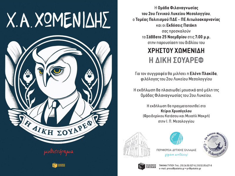 Ο Τομέας Πολιτισμού της Π.Δ.Ε. σε συνδιοργάνωση με την ομάδα φιλαναγνωσίας του 2ου Γενικού Λυκείου Ιεράς Πόλεως Μεσολογγίου και τις εκδόσεις Πατάκη σας προσκαλούν στην παρουσίαση του νέου μυθιστορήματος του Χρήστου Χωμενίδη με τίτλο «Η Δίκη Σουάρεφ», που θα πραγματοποιηθεί το Σάββατο, 25 Νοεμβρίου 2023 και ώρα 19:00, στο Κτίριο Χρυσόγελου.