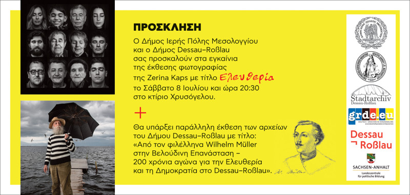 Παράλληλα στο πλαίσιο αυτής της διαδημοτικής συνεργασίας, θα πραγματοποιηθεί και έκθεση από τα Αρχεία της Πόλης του Δήμου Dessau – Roβlau, με τίτλο «Από τον φιλέλληνα Wilhelm Muller στην ειρηνική επανάσταση – 200 χρόνια αγώνων για την ελευθερία και τη δημοκρατία στο Dessau – Roβlau» στην οποία απεικονίζεται η πόλη του Ντεσάου γύρω στο 1800 ως σταθερό σημείο αναφοράς κατά τις ποικίλες μεταρρυθμίσεις του φωτισμένου πρίγκιπα Leopold Friedrich. Επιπλέον γίνεται αναφορά στον Wilhelm Muller ως ποιητή Φιλέλληνα και στη συνέχεια εξετάζεται η πρόοδος αλλά και η οπισθοδρόμηση που σημειώθηκε όσον αφορά τις προσπάθειες για ελευθερία και δημοκρατία στο Ντεσάου μέχρι την Βελούδινη Επανάσταση του 1989.