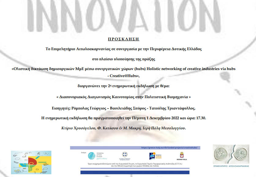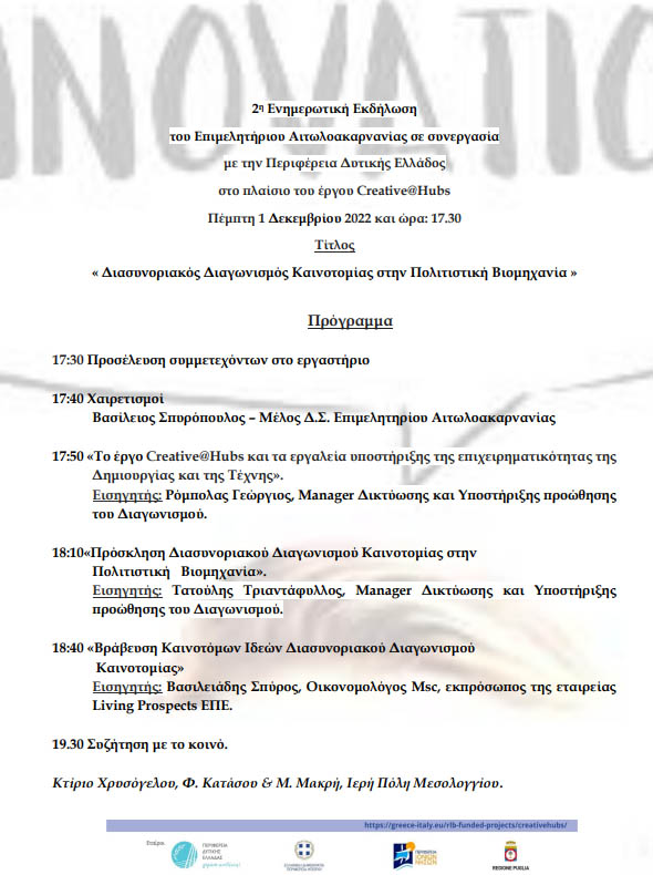 Αιτωλοακαρνανία Μεσολόγγι: Εκδήλωση για τον «Διασυνοριακό Διαγωνισμό Καινοτομίας στην Πολιτιστική Βιομηχανία» 28 Νοέ 2022 AgrinioTimes Share Tweet ☆ Ακολουθήστε μας στο Google News Σχετικά θέματα: Advertisement Τελευταία νέα →6 Δεκ 2025 01:10Ημερήσιες Προβλέψεις για τα Ζώδια (06/12)6 Δεκ 2025 01:05Εορτολόγιο: 6 Δεκεμβρίου τιμάται από την Εκκλησία ο Άγιος Νικόλαος6 Δεκ 2025 00:38Γεγονότα που σημειώθηκαν σαν σήμερα (06/12)6 Δεκ 2025 00:19Ο Καιρός (06/12): Βροχοπτώσεις στο Αγρίνιο, έως 14 βαθμούς Κελσίου η θερμοκρασία5 Δεκ 2025 23:05Σωτήρης Μπαλτάς: Στο Νέο Ψυχικό η Εξόδιος Ακολουθία και στις Παπαδάτες Μακρυνείας η ταφή του 24χρονου5 Δεκ 2025 20:00Παπαστράτειο Μέγαρο: Το Αγρίνιο σημείο αναφοράς για την Καρδιολογία με αφορμή τη διεξαγωγή του 3ου Συνεδρίου5 Δεκ 2025 19:41Δήμος Αγρινίου: Τριήμερη διακοπή κυκλοφορίας σε Τμήματα των Οδών Εθνικής Αντιστάσεως και Ιόλης5 Δεκ 2025 18:48Ερασιτέχνης Παναιτωλικός – Τμήμα Υδατοσφαίρισης: Τζώρτζης, Γρηγορόπουλος και Πετρόπουλος στο Αγρίνιο!5 Δεκ 2025 17:39Eurovision 2026: Ισπανία, Ολλανδία, Ιρλανδία και Σλοβενία δεν πάνε Αυστρία εξαιτίας της συμμετοχής του Ισραήλ5 Δεκ 2025 17:08Γιώργος Παπαναστασίου: Στη Μάλτα για τη Σύνοδο Κορυφής Ηγετών του Συμβουλίου Ευρωπαϊκών Δήμων και Περιφερειών