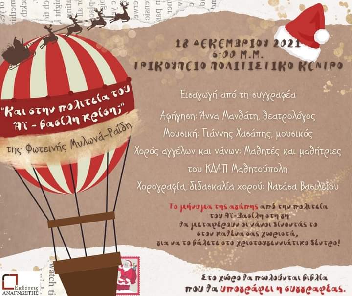 Το Σάββατο 18 ΔΕΚΕΜΒΡΙΟΥ 2021 στις 6:00 μ.μ. στο ΤΡΙΚΟΥΠΕΙΟ ΠΟΛΙΤΙΣΤΙΚΟ ΚΕΝΤΡΟ στο Μεσολόγγι, θα γίνει η παρουσίαση του παιδικού βιβλίου «Και στην πολιτεία του Αι-Βασίλη κρίση;» της Φωτεινής Μυλωνά-Ραΐδη.
