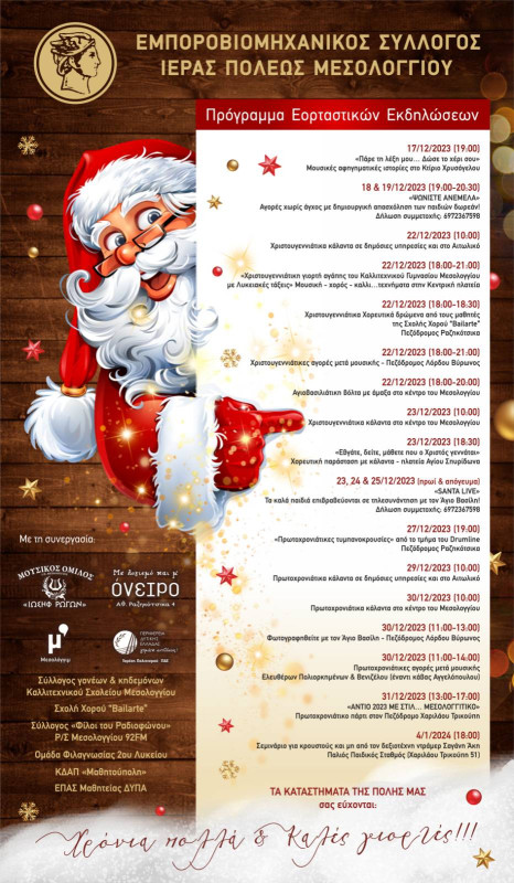 Θέλοντας να συμβάλλει στο γιορτινό κλίμα, ο Εμποροβιομηχανικός Σύλλογος Ιεράς Πόλεως Μεσολογγίου σε συνεργασία με άλλους φορείς και τοπικές επιχειρήσεις, διοργανώνει μια σειρά εκδηλώσεων που θα ενθουσιάσουν τους καταναλωτές, κάνοντας πιο ευχάριστες τις βόλτες τους στους εμπορικούς δρόμους της πόλης.