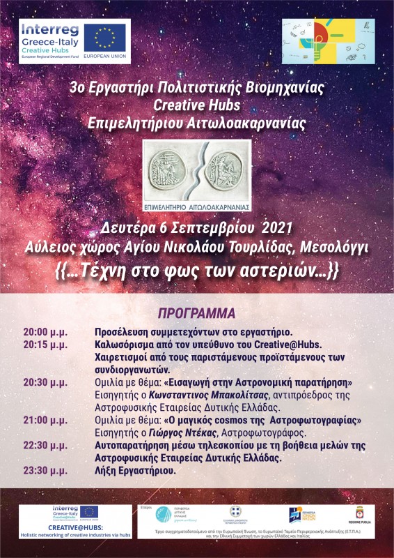 Το Επιμελητήριο Αιτωλοακαρνανίας στο πλαίσιο υλοποίησης της πράξης «Ολιστική δικτύωση δημιουργικών ΜμΕ μέσω συνεργατικών χώρων (hubs) Holistic networking of creative industries via hubs – Creative@Hubs», συνδιοργανώνει εργαστήρι διεύρυνσης γνώσεων με θέμα: «Τέχνη στο φως των αστεριών» σε συνεργασία με την «Αστρονομική και Αστροφυσική Εταιρεία Δυτικής Ελλάδας».