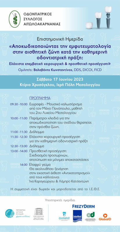 Ο Οδοντιατρικός Σύλλογος Αιτωλοακαρνανίας διοργανώνει το Σάββατο, 17 Ιουνίου 2023 στο Κτίριο Χρυσόγελου, στο Μεσολόγγι, Επιστημονική Ημερίδα με θέμα: «Αποκωδικοποιώντας την εμφυτευματολογία στην αισθητική ζώνη κατά την καθημερινή οδοντιατρική πράξη: ελάχιστα επεμβατική χειρουργική και προσθετική προσέγγιση».