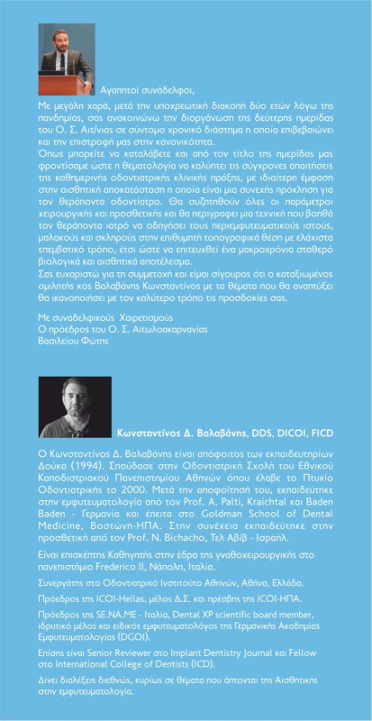 Κεντρικός ομιλητής είναι ο κ. Κωνσταντίνος Βαλαβάνης ο οποίος πραγματοποιεί διαλέξεις διεθνώς κυρίως σε θέματα που άπτονται της αισθητικής στην εμφυτευματολογία.