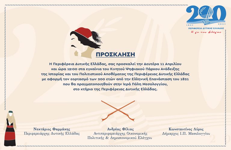 Η Περιφέρεια Δυτικής Ελλάδας και ο Δήμος Ιεράς Πόλεως Μεσολογγίου, σας προσκαλούν την Δευτέρα 11 Απριλίου και ώρα 19:00 στα εγκαίνια του Κινητού Ψηφιακού Πάρκου Ανάδειξης της Ιστορίας και του Πολιτιστικού Αποθέματος της Περιφέρειας Δυτικής Ελλάδας, με αφορμή τον εορτασμό των 200 ετών από την Ελληνική Επανάσταση του 1821, που θα πραγματοποιηθούν στην Ιερά Πόλη Μεσολογγίου, στο κτήριο της Περιφέρειας Δυτικής Ελλάδας.